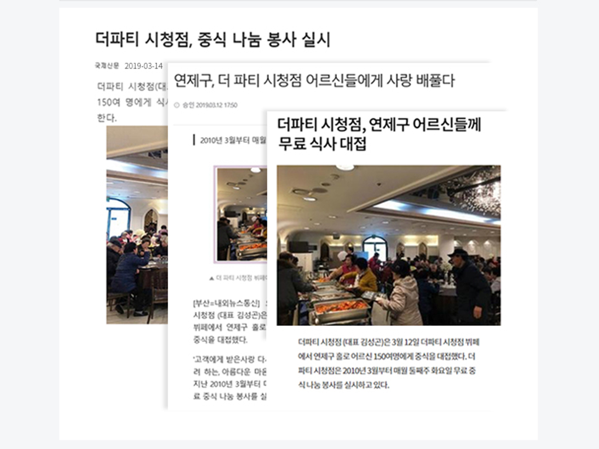 더파티 시청점 뷔페에서 연제구 홀로 어르신 150여명에게 중식을 대접하였습니다.